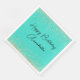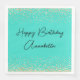 These event or party napkins feature an elegant, classic theme on a turquoise or teal coloured background. The greeting, "Happy Birthday" is printed in a black script font across the centre, followed by a sample name in a matching script font. You can personalise the plate to include your own custom name or other text. Gold glitter confetti accents the top and bottom portions of the napkin.