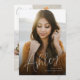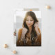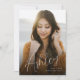 Graduation announcement with a big photo and modern script overlay.