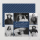 Elegant graduation announcement featuring 6 photos bordering the design. "Graduate" is displayed in a white modern calligraphy script on a navy blue background. Personalise the front of the photo graduation announcement by adding the graduate's name, school, and graduation year. The announcement reverses to display a navy and white diagonal stripe pattern. The multi-photo graduation announcement is perfect for both high school and college graduations.