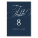 Elegant Script Navy Blue Wedding Table Number features a large, bold script and elegant styling.