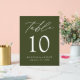 Trendy, minimalist wedding table number cards featuring "Table" displayed in a white calligraphy script with an olive green acrylic background. To order the acrylic table card sign: add your name, wedding date, and table number. Add each number to your cart individually and check out when you're finished.