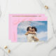 Elegant and stylish save the date card featuring a script text that says "save the date." One photo in the font and one on the back. The background is orange pink.