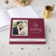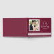 This burgundy wedding guest book features a traditional design. It offers elegant script text and a square photo frame.