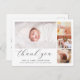 This chic timeless birth announcement and photo thank you postcard is ideal for anyone who wants to thank guests at their baby shower for the gifts, love, and support they have received and to introduce their new member of the family. The modern, elegant design has a minimalist style and features four customisable photos placed in the collage, simple elegant typography for your information, and a chic script for a ´´thank you´´ header. On the reverse, there is a customisable thank-you message with your names. Use the "customise" button to replace photos and edit text.