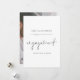 Elegant Script Photo Engagement Announcement A simple and elegant black and white design to announce your happy news. Engagement is in a modern set script is in the centre.The rest of the text you can easily personalise and replace the sample photo on the back with your own. Text and background colours can be changed if you wish to better suit your wedding theme via the customise further option.