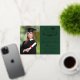 Modern green college graduation party invitation featuring real gold foil, "Class of" in an illustration of laurel wreath incorporating a grad cap topper and diploma, a photo of the graduate and their name in an elegant script. Add their school, major, honours or future plans below. On the back, add the party details in light gold typography.