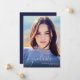 Modern Elegant Script Photo Graduation Announcement featuring your photo and our trendy script overlay in white The back is a modern navy blue, but all fonts and colours are easily modified. Stylish swirly text sets off your photo. Perfect for celebrating your graduate! Chic and darling. Please contact us at cedarandstring@gmail.com if you need assistance with the design or matching products.