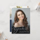 Celebrate your graduate's achievements with this stylish blue graduation announcement and party invitation featuring their photo overlayed with "Graduate" in a stylish white script and their name, school and class year. On the back, add an additional photograph and your graduation party details in modern white lettering.