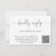 Elegant wedding RSVP card that features "kindly reply" in a chic calligraphy script. Input your wedding website address to create a QR code your guests can scan to RSVP online. The reverse side features your photo overlayed with your first names and wedding date joined together with by heart.