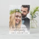 Elegant elopement or small wedding announcement and reception invitation to let family and friends know that you were married in a small intimate wedding ceremony, and to invite them now to a wedding reception. The front features your wedding day photo overlayed with "Happily Ever After Party" in a mix of simple typography and a trendy script with swashes. Under your photo, add your first names and wedding date. On the reverse side, personalise your message in more detail and add party or reception details and your names in a signature-like script.