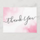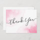Elegant thank you postcard featuring the text "thank you" across the card in a dark grey handwritten script font on a background with pink watercolor splashes