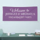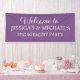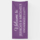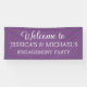 Cute, elegant script purple engagement party welcome banner, personalised with the name of the bride and groom to be.  The background colour of this banner is customisable with Zazzle's design tool, so whatever your engagement party colour theme, you can create your banner to match.  Contact me for help with customisation or to request additional products for your suite.