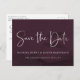 Elegant watercolor deep purple cassis background, wedding save the date postcard. Card features elegant calligraphy "Save the Date", on front and back. Coordinating floral accent bouquet.