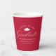 Elegant graduation paper cups featuring a graduation cap with the phrase "Cheers to the Graduate" in a white calligraphy script on a red background. Personalise the modern graduation paper cups with the graduate's name, school name, and graduation year. The design repeats on the back. The simple graduation cups are perfect to use for your high school or college graduation party.