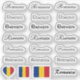 Countour Stickers: Elegant script Name set - Romania & Romanian Flag - custom name in 6 x 3 different handwriting personal fonts. Cool black handwritten stickers allows you to mark your items, put name on with personal touch / name can be costumised