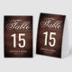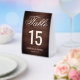 Elegant table number cards featuring cursive script against a rustic barn wood background.