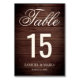 Elegant table number cards featuring cursive script against a rustic barn wood background.