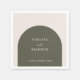 Transform your reception table setting into a cohesive, thoughtfully designed space with these elegant, minimal personalised wedding napkins. Each modern napkin features a boho dark sage green arch set against a neutral beige backdrop, with the bride and groom names and wedding date elegantly printed inside using delicate life roman script typography.