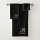 An elegant monogrammed black towel set with white script initial, and serif last name. A perfect style accent colour for an earthy neutral spa vibe bathroom.