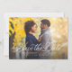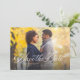 Share the news of your engagement and upcoming marriage with this one-photo horizontal save the date card featuring an elegant type treatment in white that sits at the bottom of a horizontal photo. The back is a neutral shade with a subtle grid pattern. The colour can be adjusted by clicking "Customise."