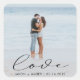Personalised sticker with your custom photo and elegant script "love" coupled with your own monograms and date in a sans serif font.