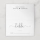 Elegant wedding table number place card with "table" in a stylish calligraphy script with swashes and blank lines for you to fill in the table number and the name of your guest. On the back, add your first names joined by a heart and your reception date.