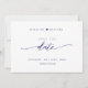 Announce your wedding date with this beautiful wedding save the date card. Modern hand written Script details in navy blue faux foil in both front and back over white background. Back with unique Save the Date stamp/monogram with couples names in white. Clean and simple style. White and navy design. Same design with back in navy blue and text in white also available. Area for wedding website, more information or/and message for your guests (i.e. "Can't wait to see you there!").