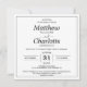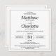 Elegant script wedding physical or digital printable square invitation in white with black lettering and a delicate frame. Personalise it with the Mr. and Mrs. names, surnames, date, location, registry, and RSVP information. The back can be customised with the couple's initials.