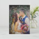This Happy New Year photo card design shown for a newlywed couple features a portrait photo from the wedding day with a stylish white custom text overlay design and scroll frame. The back of the card features a deep navy / midnight blue background colour that can be modified with a white arrow pattern.