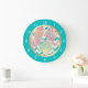 This elegant wall clock features faux glitter, colorful seashells in multiple colors of teal, coral pink, aqua, and gold. The shells are placed on aqua blue chevron stripes that also contain images of the shell pattern, and those are contrasted with white chevron stripes. White numbers on a band of matching teal make the clock easy to read. A gold circle frame separates the pattern from the teal blue band. Pretty!
