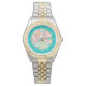 This elegant wristwatch for her features faux glitter, colourful seashells in multiple colours of teal, coral pink, aqua, and gold. The shells are placed on aqua blue chevron stripes that also contain images of the shell pattern, and those are contrasted with white chevron stripes. White diamond makers on a band of matching teal make the watch easy to read. A gold circle frame separates the pattern from the teal blue band. Pretty!