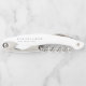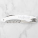 This wedding corkscrew features elegant dark blue lettering that says the couple's names and the date of the marriage, in a serif font.