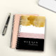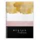 Personalised notebook with a combination of a gold texture, rose gold glitter and white with various colours as a bottom monogram holder. The monogram is a combination of a sans serif and elegant script font. Check out our store for more items from this collection.