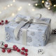 Elegant wrapping paper sheet design featuring stylised snowflakes on silver background.