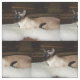 Seal Point Siamese cat keeping warm on a faux white lamb's wool throw blanket on the couch. She's laying so pretty with her tail curled and her stunning blue eyes.
