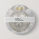 Personalised button with a magical holiday design. Featuring a silver Christmas ball with snowflake decorations and finished off with a pretty silver bow. The background is a silver bokeh lights illustration.