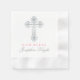 Elegant baptism or christening party napkin for a baby girl features a decorative silver cross with "God Bless" text and the baby's name in silver and pink tones on a clean white background. A classic keepsake detail for your baptism celebration table. All text can be fully personalised.