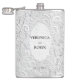 Celebrate love in timeless style with this elegant silver floral wedding flask. Featuring a sophisticated scroll pattern and personalised with the couple’s names and special date, this keepsake is perfect for weddings, anniversaries, or bridal party gifts. The delicate design, centred around a classic oval frame, makes it a refined memento for your special day.