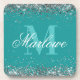 Stylish Silver Glitter Teal Blue Green and White Monogram beverage coaster with a customizable calligraphy script name and bold monogram template.