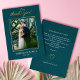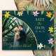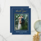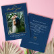 This simple and minimalistic photo thank you card features elegant gold script text with a heart between the words "thank you." You can personalise the design by adding the bride and groom's names, date, message to friends and family, and your favourite photo. This card is part of my Colourful Gold Tropical Lily Wedding Collection; please browse my collection for more matching wedding items. The card comes in four background colours: teal, blue, black, and white.
