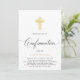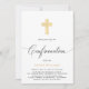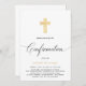 Modern, minimalist Confirmation invitation featuring gold cross on a white background, celebration details in trendy lettering and script ''Confirmation'' in handwritten elegant lettering.
