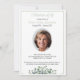 The invite features an oval shaped portrait photo with elegant simple border of a sage green line. Green eucalyptus leaves symbolises remembrance, peace, and strength.
