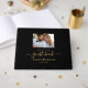 Elegant Simple Gold Script Wedding Black Guest Book Personalised. Wedding Guest Book in black and gold. Features modern „guest book” text in hand lettered swash tail font calligraphy, wedding date and couples first name with love heart motif/shape. Customise with your favourite photo and personalise your information. It great for wedding or anniversary day.
