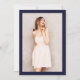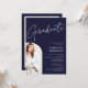 Elegant simple modern white on navy blue photo graduation announcement invitation featuring cool modern brush script font, 2photos, and an arch overlay. Perfect grad celebration for senior high school open house party.