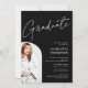 Elegant simple modern white on black photo graduation announcement invitation featuring cool modern brush script font, 2photos, and an arch overlay. Perfect grad celebration for senior high school open house party.