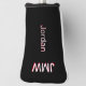 Colour shadows elevate this simple-looking cover for golf clubs by adding red shadowing to the name and monogram initials. We have used white, shadowed by red, for your three-initial monogram, at the upper end of the cover, and your name (first or last your choice) perpendicular to the monogram. While we've selected white piping, play around with the various colours to choose your personal favourite. A simple, non-serif font has been selected for the text on this custom golf club head cover that can be fully personalised as you wish. It is a wonderful, personal gift for your loved ones who enjoy golfing as a sport.