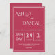 Introducing our chic and modern wedding invitation featuring elegant white calligraphy on a rich magenta background with a chic frame. This design is perfect for the couple seeking a stylish and contemporary look for their special day. The crisp white calligraphy stands out beautifully against the bold magenta backdrop, creating a sophisticated and eye-catching invitation. The high-quality cardstock and your choice of size and paper type ensure a luxurious and personalised touch. Whether you're looking for a minimalist design or a pop of colour, this wedding invitation will leave a lasting impression on your guests. Make your wedding celebration unforgettable with this stylish and contemporary invitation.
