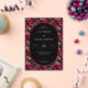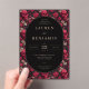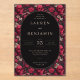 This is a gothic style image featuring an elegant wedding invitation set against a rich, dark background adorned with vibrant red flowers and skulls. The central oval frame in black highlights the names "Lauren and Benjamin" along with the event details in sophisticated gold lettering. It exudes a unique blend of elegance and edginess, perfect for couples who love a touch of the macabre mixed with traditional romance. Ideal for setting a distinctive tone for your special day.