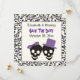 Elegant skulls Halloween purple wedding Save the Date announcement, featuring a black skull couple bride and groom on ivory background and a skull pattern border. The groom wears a purple hat and the bride a purple bow. Want help or a different colour scheme? Just click on Contact button under the product and ask for it!