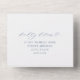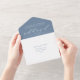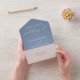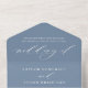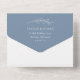 Sophisticated slate blue and white all in one wedding invitation showcasing flowing calligraphy script with classic serif accents. The soft, dusty blue background highlights "Wedding Of" in graceful hand lettering for a calm, refined elegance. Features a tear-off RSVP postcard with meal selections and individually personalizable guest addressing on the back — simply fold, seal, and send. A delicate botanical leaf detail adorns the return address flap. All text and colours are fully customisable.